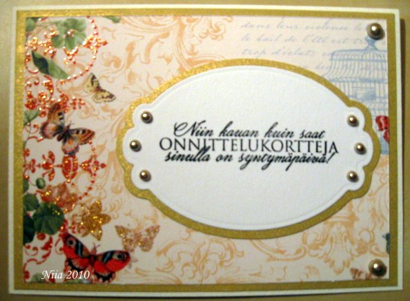 Näissä on ihania värejä ja kuvioita, mutta itselläni on ollut vaikeuksia saada näistä kortteja aikaiseksi. Nyt kuitenkin tein tällaisen eräälle 60 vuotta täyttävälle rouvalle.