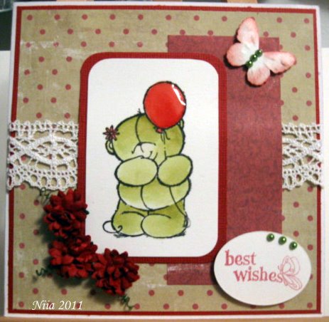 Heipä hei ja kiva kun osallistut Forever Friends haasteeseen. Korttisi on todella suloinen. Ihana on tuo pitsi ja perhonen niin kaunis!