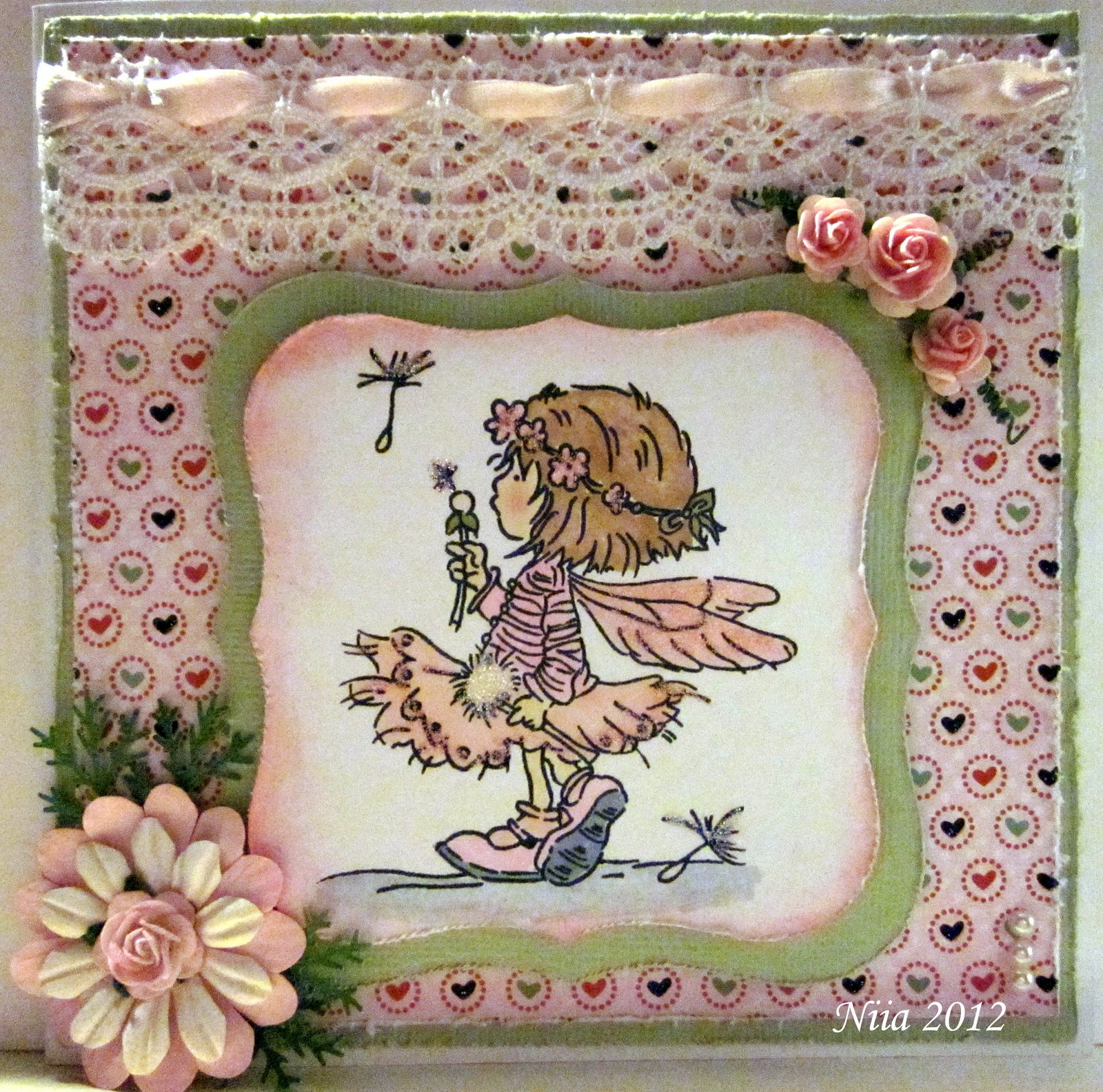 Olen mukana rivillä 3D-tarra (leimasinkuva ja sen alla oleva kartonki kohotettu tarroilla)-pinkki-ressaus.
