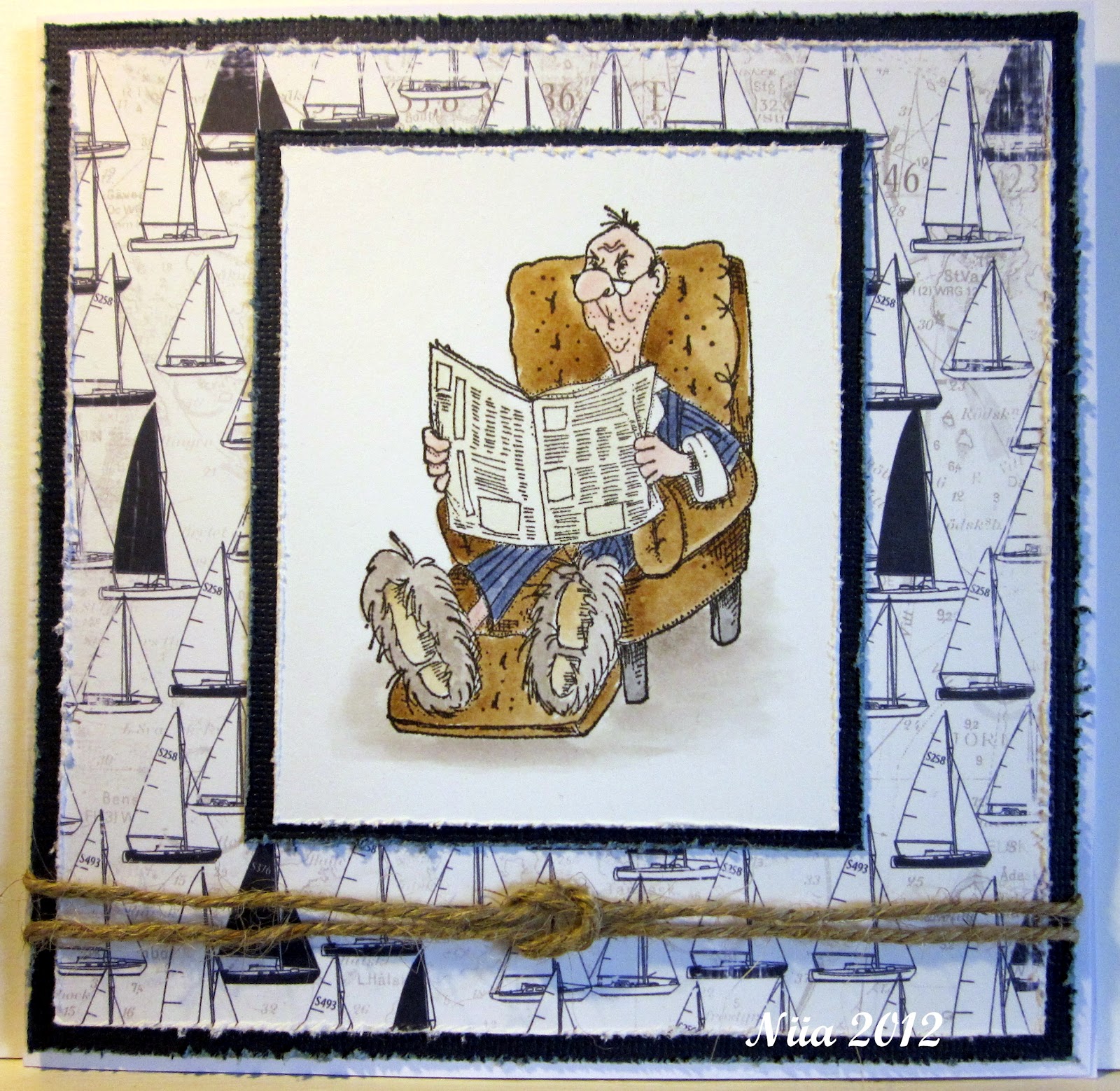 Tämän kortin väsäsin eilen kaverilleni. Hän kun halusi 50 vuotta täyttävälle, purjehdusta harrastavalle sekä Hesaria lukevalle tuttavalle kortin. Todella pitkä tauko on kortin teossa ollut, mutta nyt se tuntui todella kivalle :).